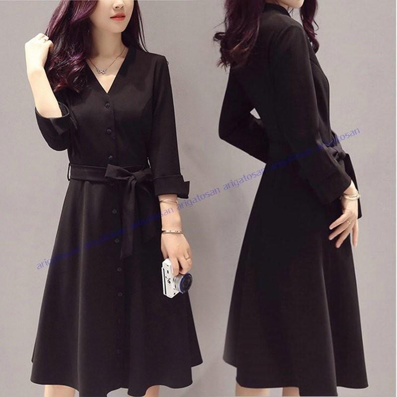 シャツワンピース ワンピ ブラック ワンピース 膝丈 Vネック 長袖 秋冬 ひざ丈 無地 大きいサイズ ワンピ リボン ベルト付き 30代 40代 二次会 お洒落 lzm003 レーちゃん 通販 Yahoo ショッピング